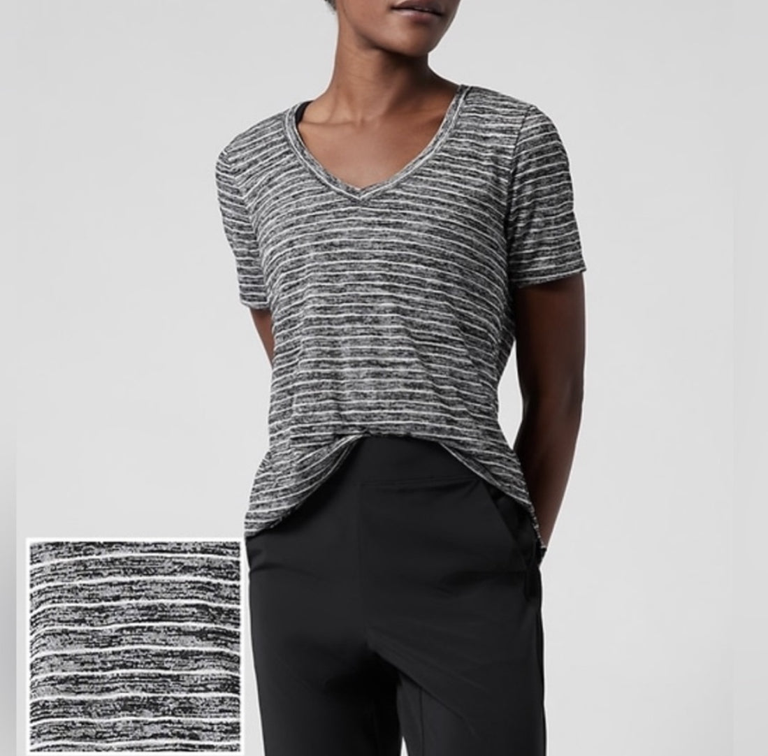 ATHLETA Charcoal Stripe V-neck Short Sleeved Breezy Tee, Small New! A4